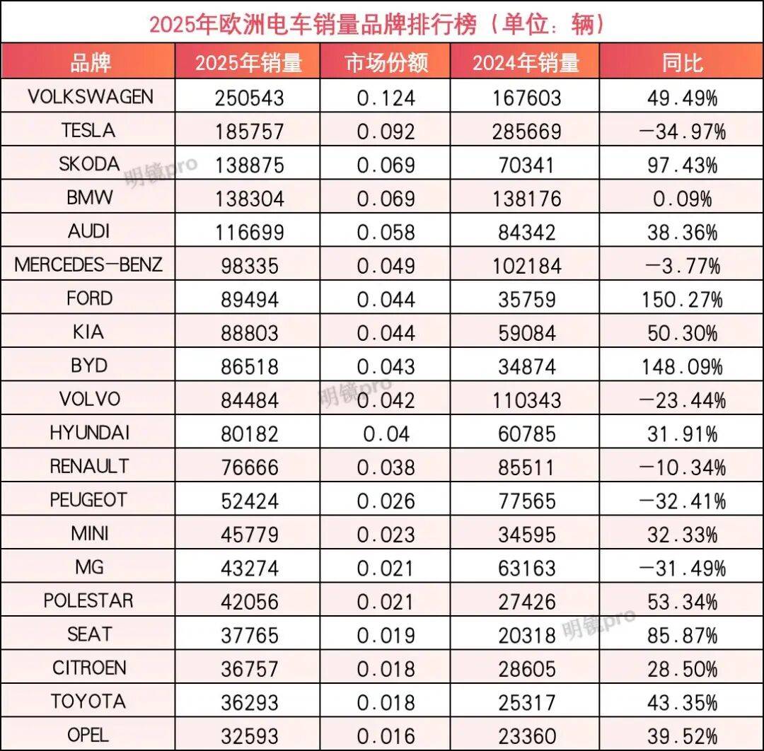 除了中國電車品牌外,歐洲其他電車品牌競(jìng)爭(zhēng)也非常激烈,多家品牌的銷量都實(shí)現(xiàn)了大幅增長。尤其是大眾、斯柯達(dá)的猛烈進(jìn)攻,2025年歐洲電車TOP3發(fā)生了座次變化,大眾反超特斯拉,拿下第一;斯柯達(dá)則反超寶馬,首次躋身第三位。