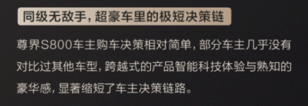 尊界S800在市場中的競爭力并非單純依賴豪華感,而是更傾向于在智能化體驗上的突破,二者兼容的雙重滿足極大地縮短了高凈值用戶的購車決策鏈。許多車主表示,他們在了解尊界S800后,幾乎沒有做過其他車型的對比,直接決定購買。