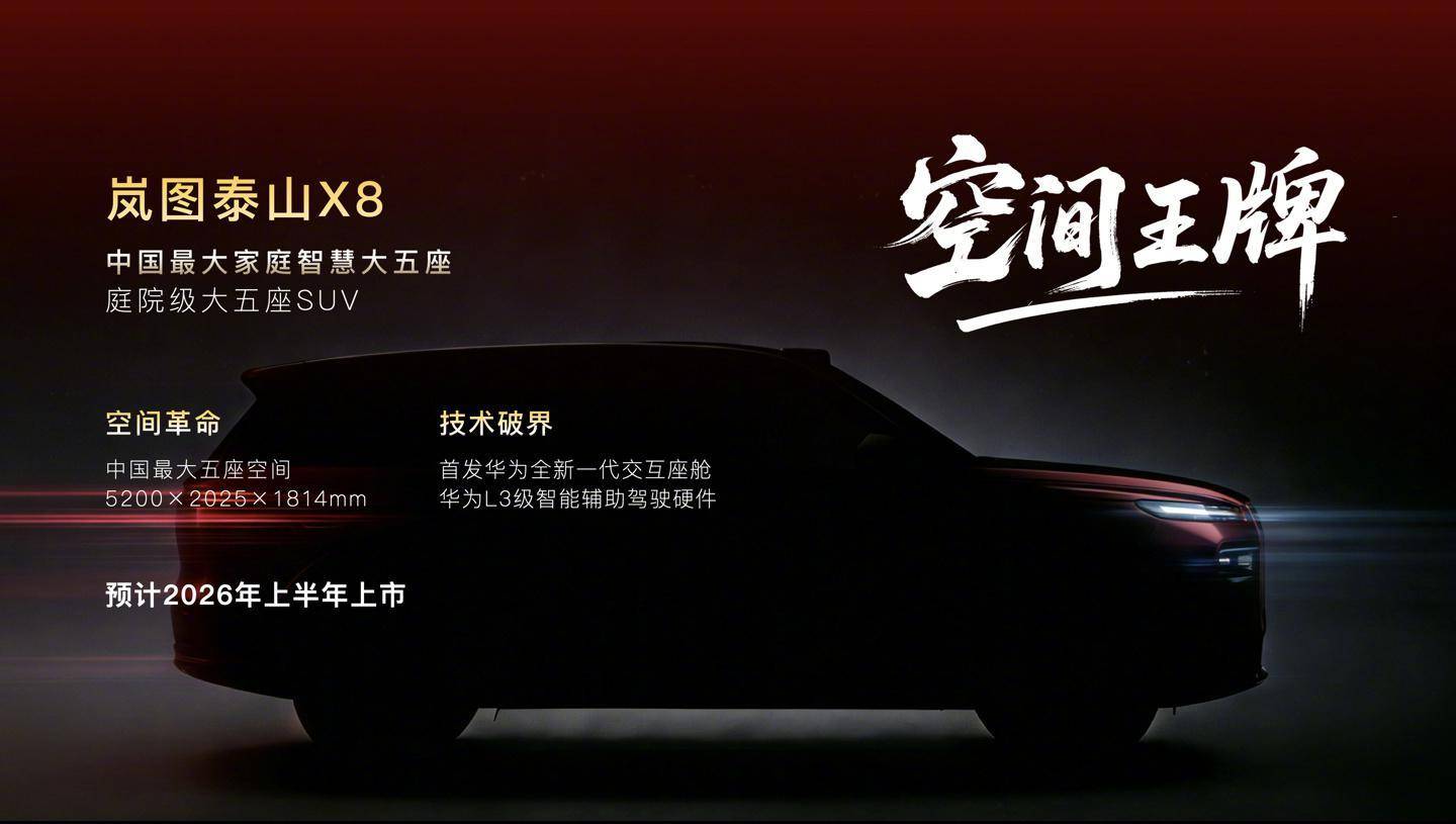 或許是因為看到2025年的大六座大型SUV市場競爭格外激烈,也可能是因為看到同行們都在推出自家大型旗艦SUV的衍生車型。馬上,嵐圖汽車也將要推出一款庭院級大五座SUV——泰山X8。這臺嵐圖泰山X8將會擁有5200mm的車長、2025mm的車寬以及1814mm的車高,同時在技術上,它也將會首發搭載華為全新一代交互座艙、華為L3級智能輔助駕駛硬件。將會在2026年的上半年上市。