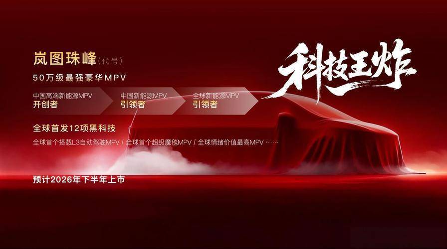 還有一款是50萬級的高端MPV嵐圖珠峰,新車將會全球首發12項黑科技,具體的有:全球首個搭載L3級自動駕駛MPV、全球首發超級魔毯MPV等等。