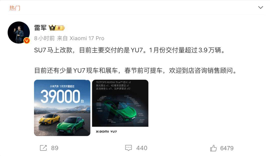 據媒體報道,現款SU7已經停產,小米汽車正在全力以赴準備新一代SU7。雷軍發布的消息也側面印證了這一點。雷軍在微博上表示,小米SU7馬上改款,目前主要交付的是YU7。目前還有少量YU7現車和展車,春節前可提車。