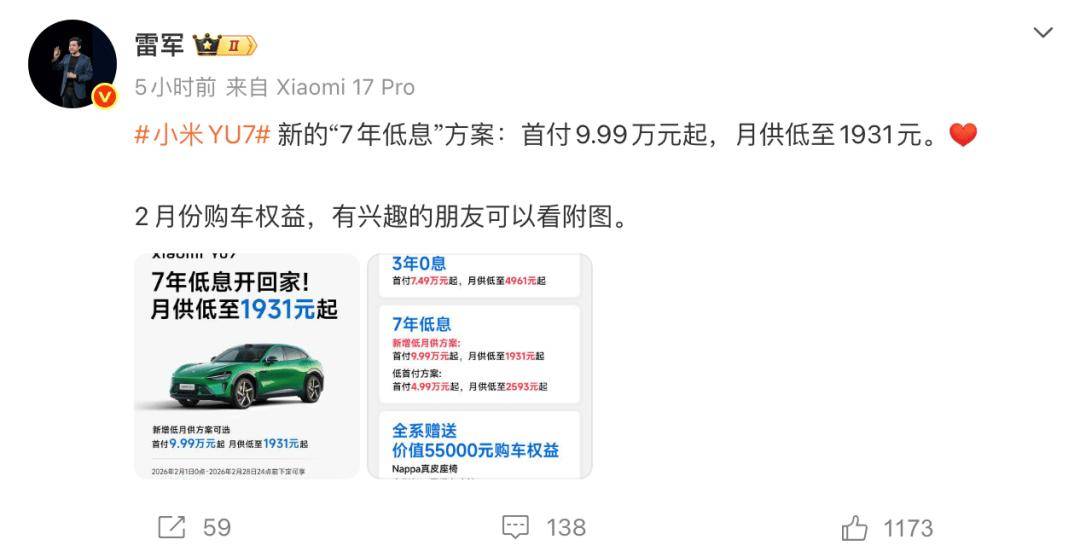 此外,不想貸款過長的用戶還能選擇3年0息方案,即首付7.49萬元起,月供低至4961元起。據了解,用戶在2月28日24點前下定,可享限時權益。雷軍還確認,一月鎖單未交付的用戶同樣能享受以上權益。
