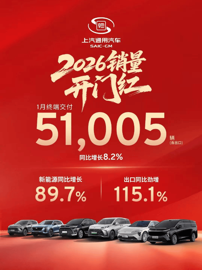 進入2026年,上汽通用迎來了強勢開局。數(shù)據(jù)顯示,上汽通用1月終端交付達51,005輛,同比增長8.2%。新能源同比增長89.7%,出口同比勁增115.1%。新能源與出口雙翼齊飛,展現(xiàn)強勁增長力。