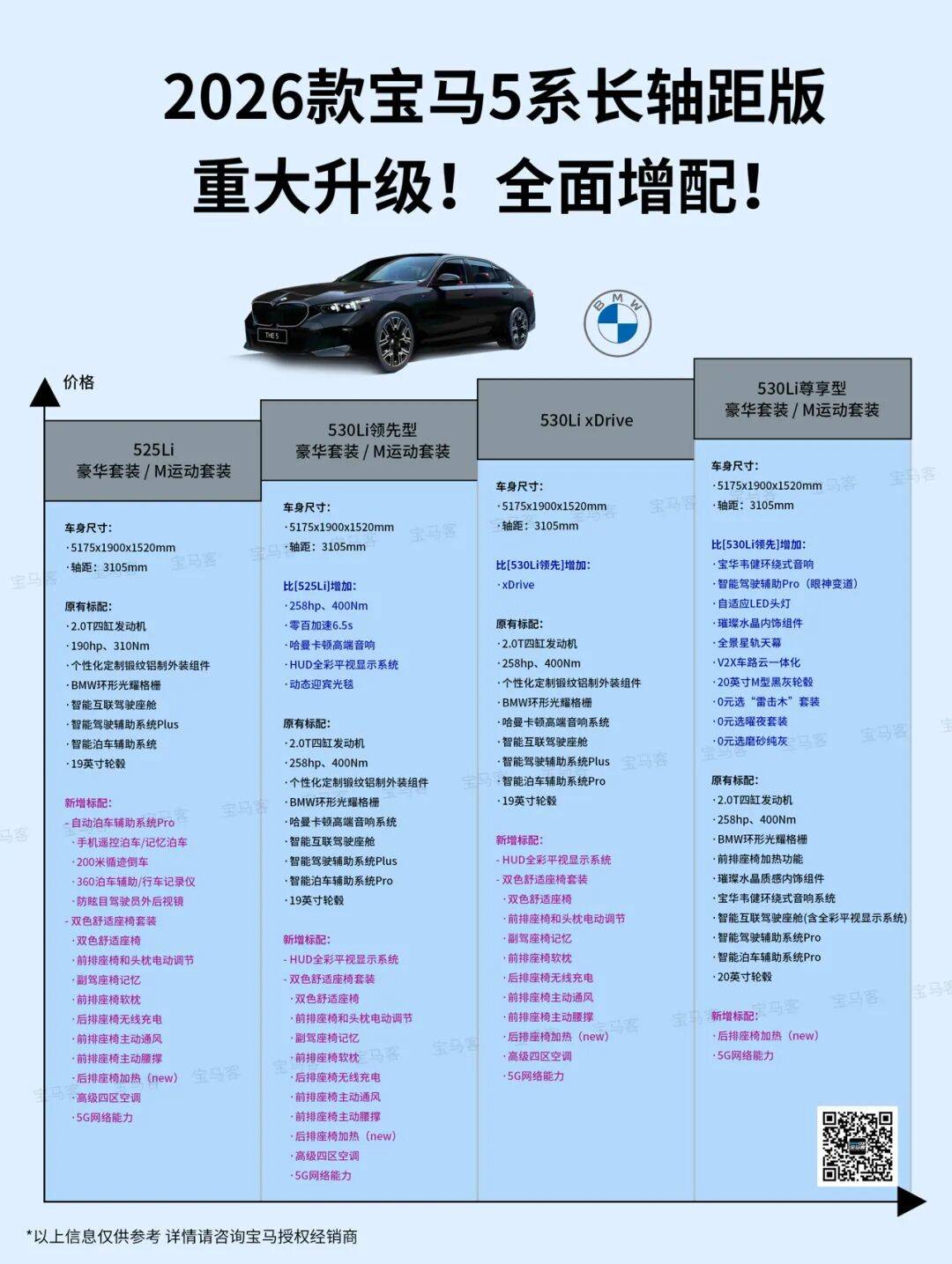 繼X5、X3、3系等主力車型陸續完成配置升級之后,寶馬終于將這份誠意帶到了中大型豪華轎車的核心——5系。2026款的寶馬5系(含i5),堪稱一次全方位、穿透式的“史詩級加強”。此次升級并非簡單點綴,而是從入門版開始大幅提升裝備水平,真正實現“入門即高配”,競爭力再度躍升。