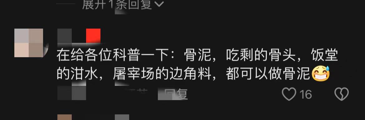 有熱心的網友科普到:骨泥,吃剩的骨頭,飯堂的泔水,屠宰場的邊角料,都可以做骨泥。