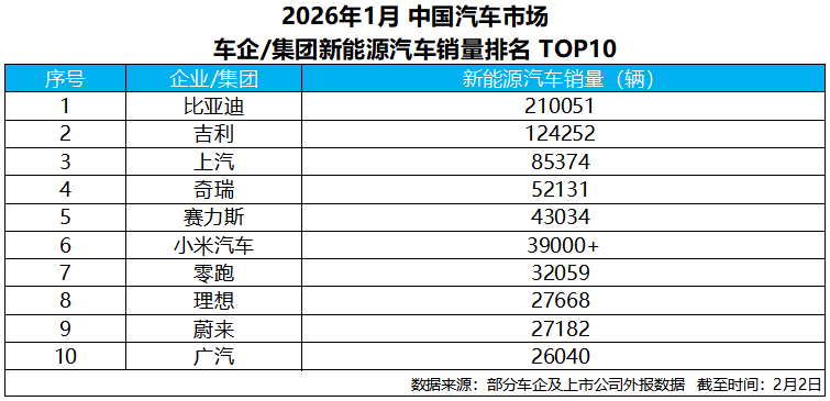 剛進(jìn)入2026年,中國(guó)新能源汽車市場(chǎng)的競(jìng)爭(zhēng)輪廓迅速顯現(xiàn),頭部車企之間的差距在1月銷量榜單中被進(jìn)一步拉開。