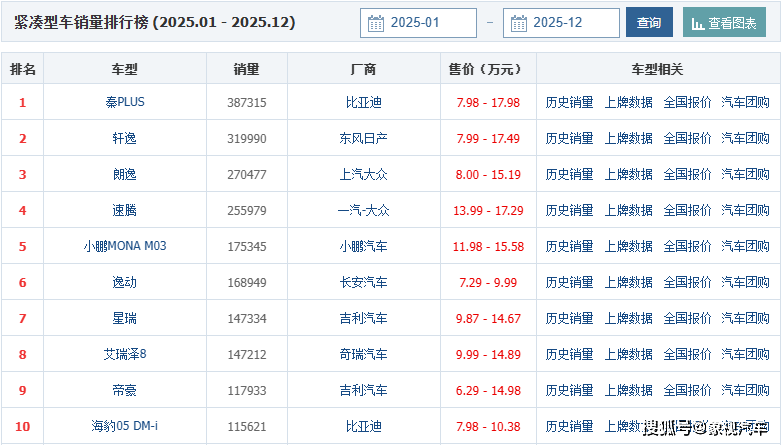 其中,秦PLUS在2025年爆賣387315輛,以極大優勢力壓軒逸、朗逸等合資產品,連續3年(2023-2025)榮獲緊湊型轎車市場年度銷量冠軍。