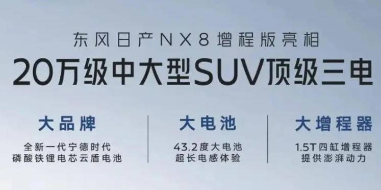側(cè)面擁有流暢簡潔的車身線條,時下所流行的懸浮車頂以及隱藏式門把手也都沒有遺漏。車尾將搭載2.4米超長貫穿式星環(huán)燈,擁有2064顆OLED發(fā)光單元。尺寸方面,新車長寬高分別為4870/1920/1680mm,軸距為2917mm,屬于是勉強(qiáng)達(dá)到了中大型SUV的水準(zhǔn)。最后,按照廠家說法,東風(fēng)日產(chǎn)NX8增程版是“20萬級中大型SUV頂級三電”,具備大品牌、大電池、大增程器的特點(diǎn),想買它的可以多關(guān)注下。