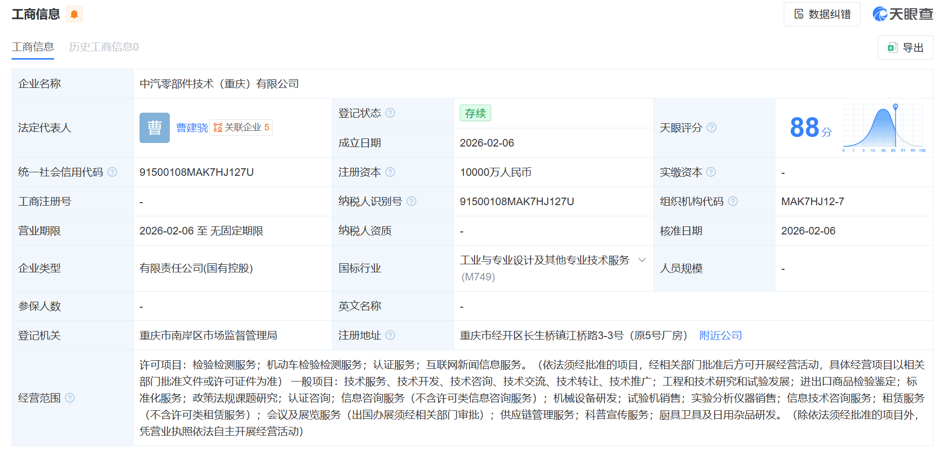 近日,中汽零部件技術(重慶)有限公司在重慶正式注冊成立,注冊資本1億元人民幣,法定代表人為曹建驍。該公司的成立,是中國汽車技術研究中心有限公司(以下簡稱“中汽中心”)與中國長安汽車集團有限公司(以下簡稱“長安汽車”)深化產業鏈協同的重要舉措。