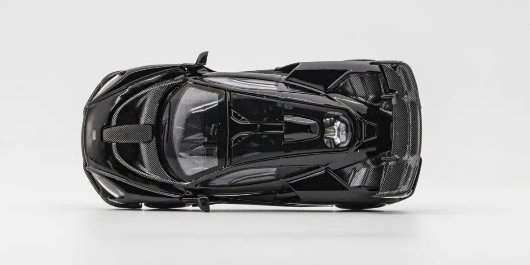 模型的整體漆面中規中矩,車頂用浮雕復刻了蝴蝶門的開門結構。模型的發動機也有碳纖維貼紙細節。雨刮器是和擋風玻璃一體成型,然后再畫成黑色的。發動機艙兩邊的導風口。模型的車頂有類似F1的進氣口,通過發動機艙上方的透明窗能夠看到一些發動機細節。