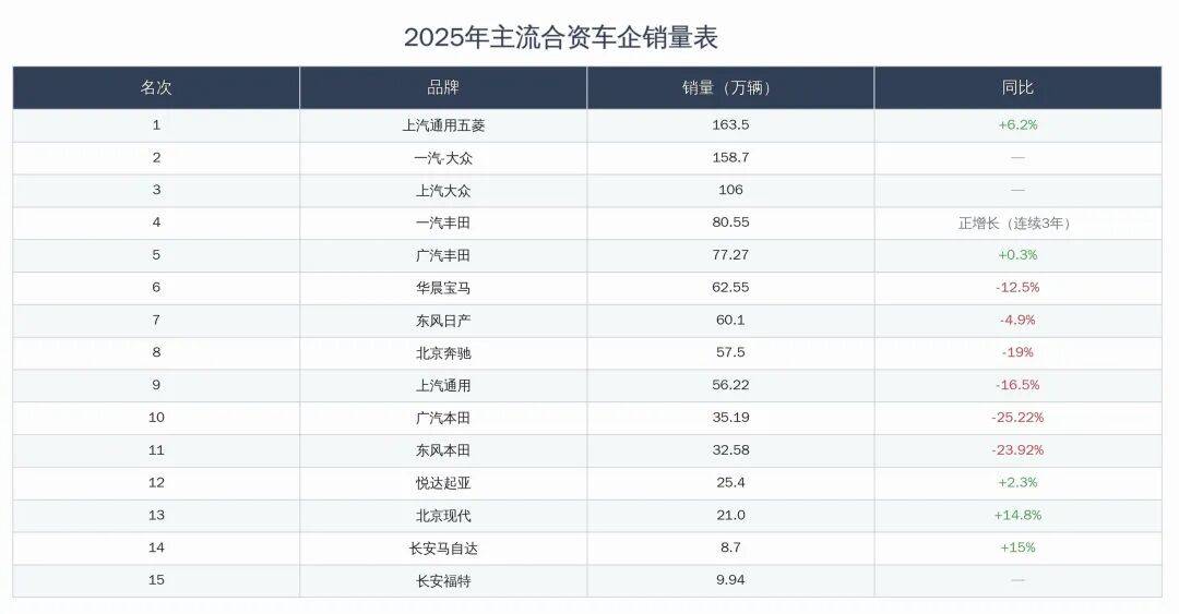 根據(jù)各合資車企提供的數(shù)據(jù),2025年15家主流合資車企中,銷量正增長(zhǎng)的7家,負(fù)增長(zhǎng)的8家,跌幅達(dá)到兩位數(shù)的5家。