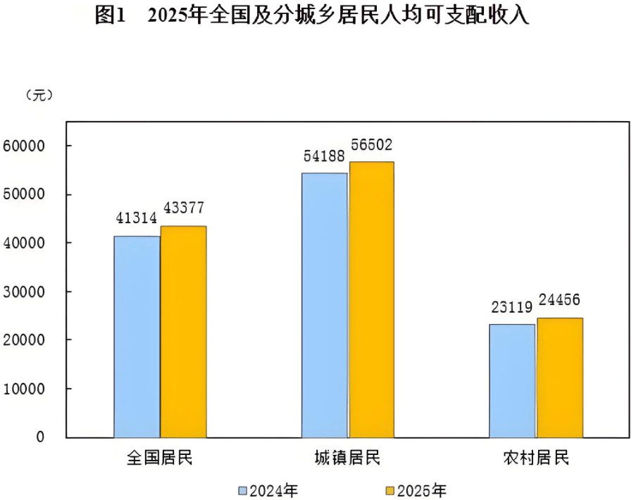 先看一組國家統(tǒng)計(jì)局公布的數(shù)據(jù)。2025年全國居民人均可支配收入為43,377元,中位數(shù)為36,231元(更真實(shí)代表普通居民的收入狀況)。