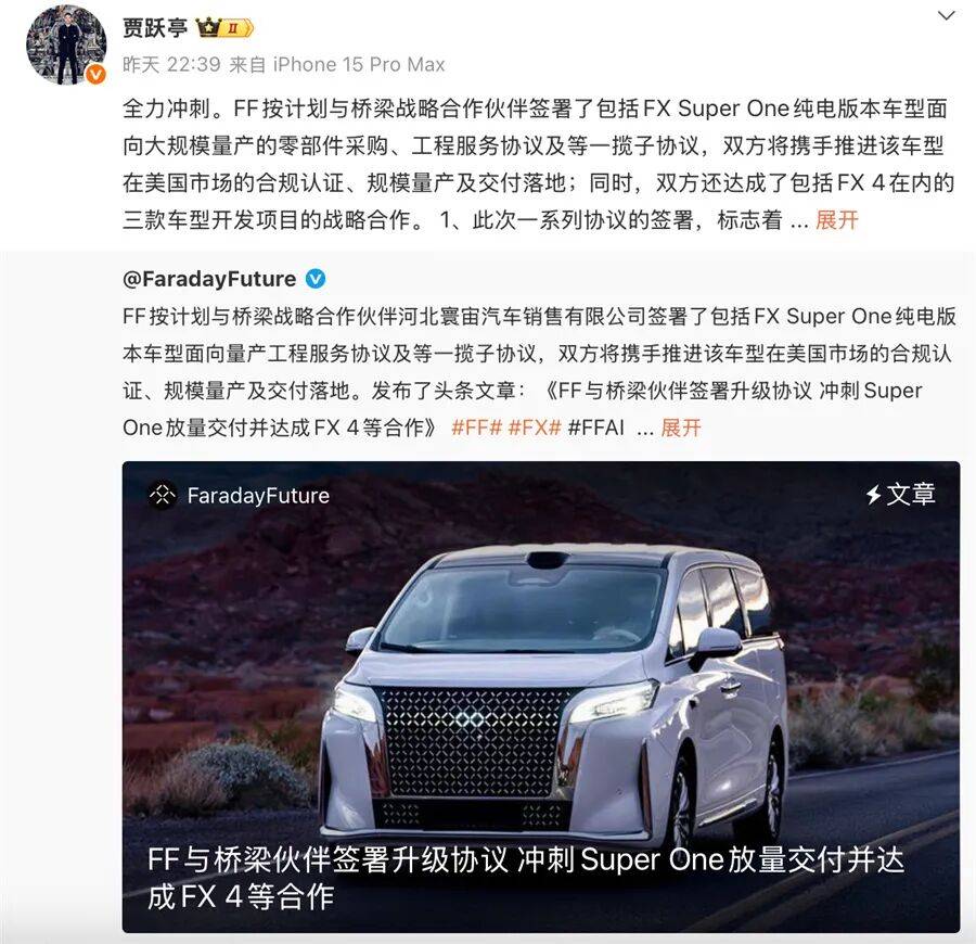 FF和河北寰宙簽署一攬子協(xié)議的主要目的是為推進(jìn)FX Super One純電版本車型的量產(chǎn),賈躍亭微博提到,此次一系列協(xié)議的簽署,標(biāo)志著FF與橋梁伙伴的戰(zhàn)略合作關(guān)系進(jìn)一步升級(jí)和深化,雙方將共同沖刺FX Super One規(guī)模量產(chǎn)交付,進(jìn)一步確保今年SOD各階段的按期完成。