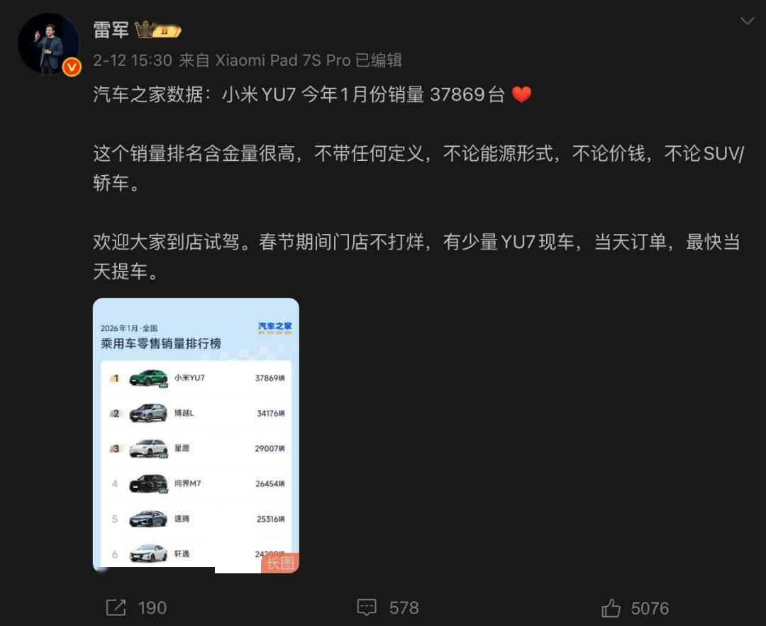 日前,小米集團創(chuàng)始人、董事長兼CEO雷軍通過微博官宣,據(jù)2026 年1月全國乘用車零售銷量數(shù)據(jù),小米YU7以37869輛的成績登頂榜首,成為當月中國銷量最高的乘用車。雷軍特別強調(diào),該排名不帶任何定義,不論能源形式、價格區(qū)間,也不分SUV與轎車品類,含金量很高。