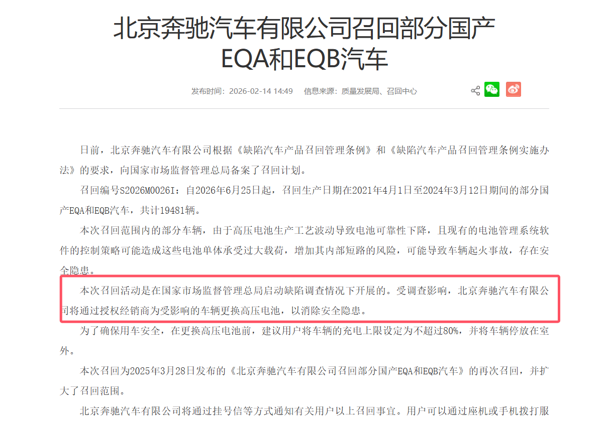 顯然,從國家市場監督管理總局發布的消息來看,部分車輛存在起火風險。在這種情況下,由于受到國家市場監督管理總局啟動缺陷調查的影響,北京奔馳決定召回相關車輛。