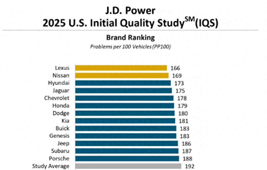 前些日子,大名鼎鼎的J.D.Power發(fā)布了老美那邊的2025新車質量調查榜單,榜單統(tǒng)計的是新車購買后90天內每100輛車出現(xiàn)的問題數(shù)(PP100),數(shù)字越低越好。而榜單上的排名似乎跟咱們想象的有些出入,跟J.D.Power的中國榜單也有些差異。今天漫哥來吹吹水,看看老美那邊哪些品牌的新車更可靠的。