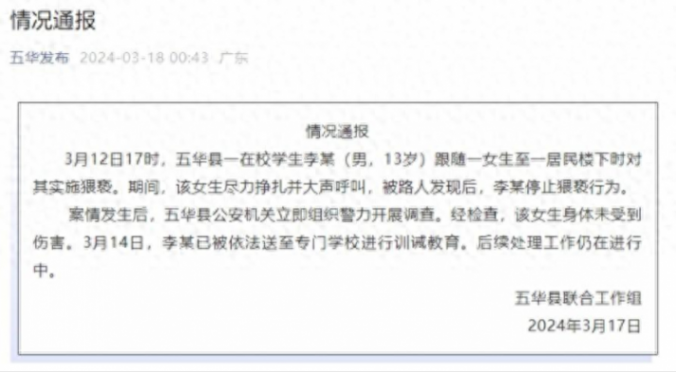 3月17日,有網友發布一段監控視頻稱, 視頻中顯示的時間為今年3月12日下午,一名男孩將一名女孩拖行至角落處,可以聽到女孩在哭叫。據廣東省梅州市五華縣聯合工作組18日凌晨通報,3月12日17時,五華縣一在校學生李某(男,13歲)跟隨一女生至一居民樓下時對其實施猥褻。其間,該女生盡力掙扎并大聲呼叫,被路人發現后,李某停止猥褻行為。案情發生后,五華縣公安機關立即組織警力開展調查。經檢查,該女生身體未受到傷害。3月14日,李某已被依法送至專門學校進行訓誡教育。后續處理工作仍在進行中。