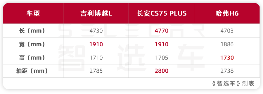 從車身尺寸來看,長安CS75 PLUS是三款車中長度和軸距最長的,吉利博越L的寬度與CS75 PLUS持平,哈弗H6的高度要略占優勢。