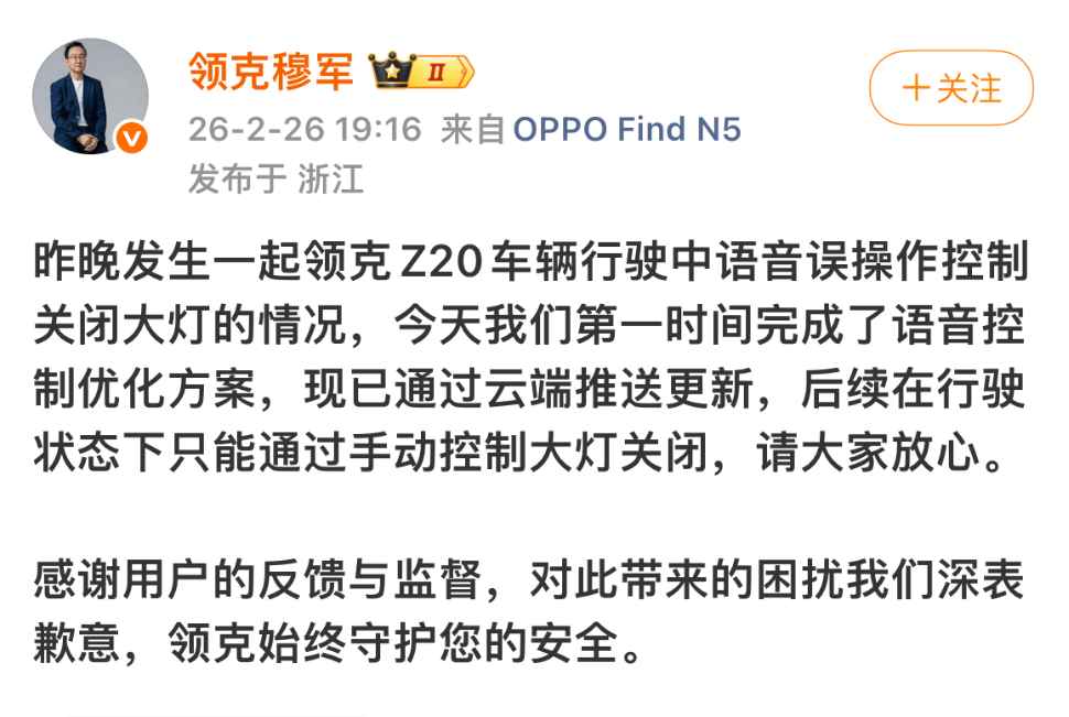 關于領克Z20因語音指令識別錯誤而引發(fā)事故,廠方的回應還算及時,態(tài)度也較為誠懇。2月26日,領克汽車銷售有限公司副總經理穆軍在其個人微博上公開回應:“今天我們第一時間完成了語音控制優(yōu)化方案,現(xiàn)已通過云端推送更新,后續(xù)在行駛狀態(tài)下只能通過手動控制大燈關閉,請大家放心。”