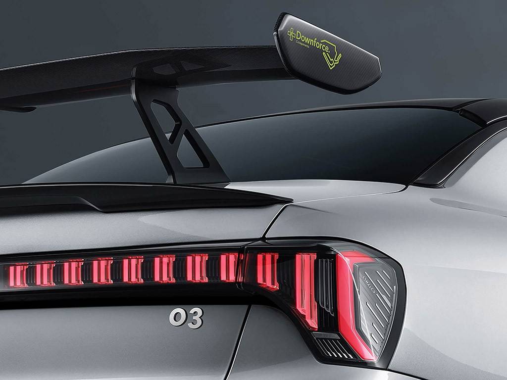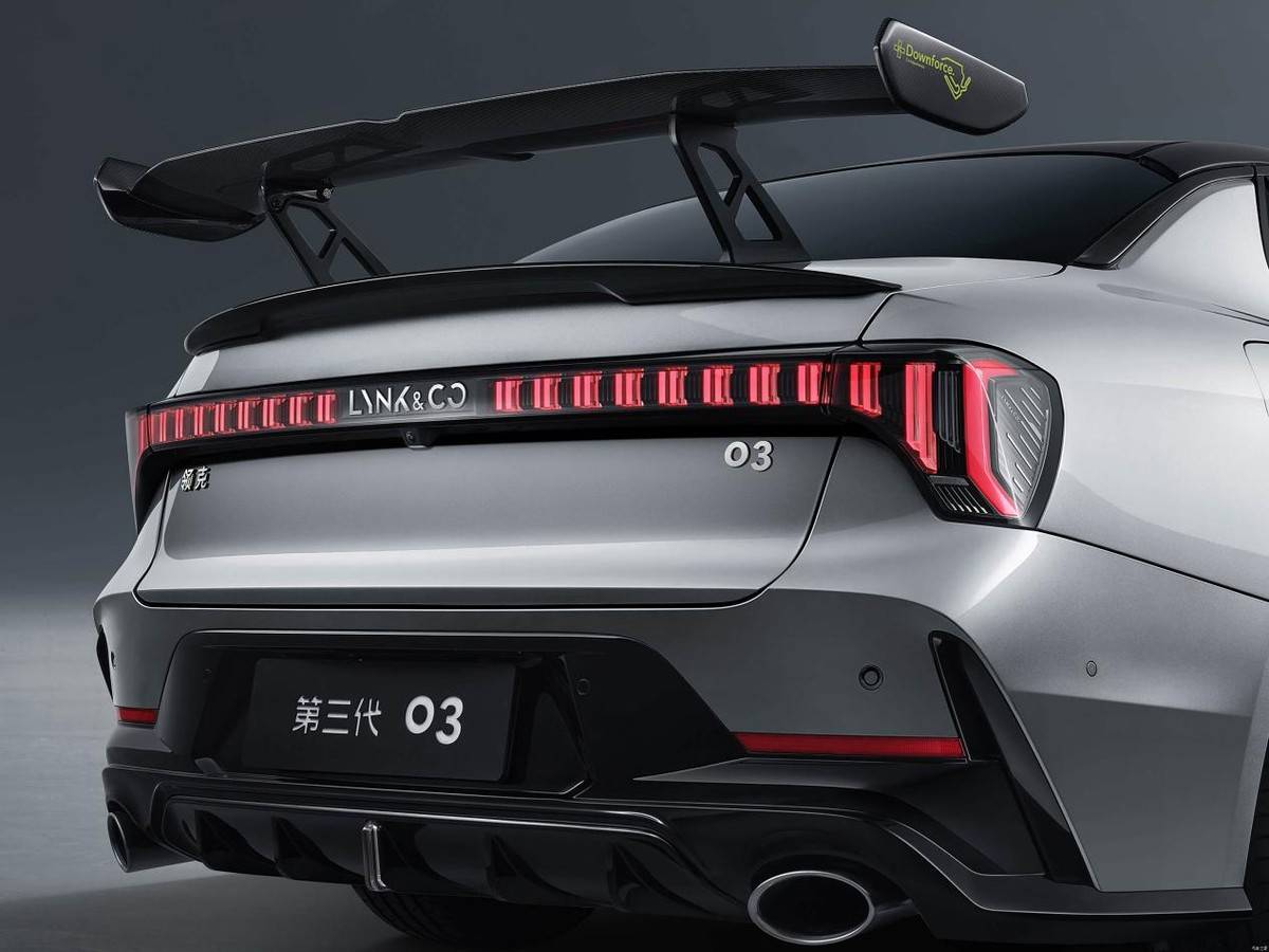 車尾部無疑是此次新款領克03的重點,畢竟名字里帶“大尾翼版”了,所以大尺寸的尾翼肯定得安排上。據悉,該尾翼是碳纖維的,并且可以支持0°/8°/16°三段可調,以用于滿足不同行車狀態下的車輛穩定性。