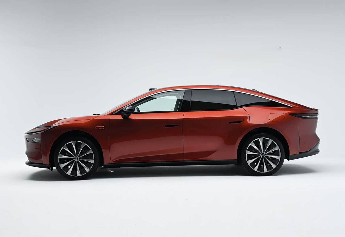 車身側(cè)面線條平直,前后翼子板采用寬體設(shè)計(jì),車頂線條向后延伸形成溜背式造型。新車配備20英寸多條輻輪圈和半隱藏式車門把手。尺寸方面,長(zhǎng)寬高分別為5130mm、1965mm和1506mm,軸距為3020mm。車頂前方可見激光雷達(dá),前翼子板處也裝有感知攝像頭,這些是為Momenta R6智駕輔助系統(tǒng)準(zhǔn)備的硬件。