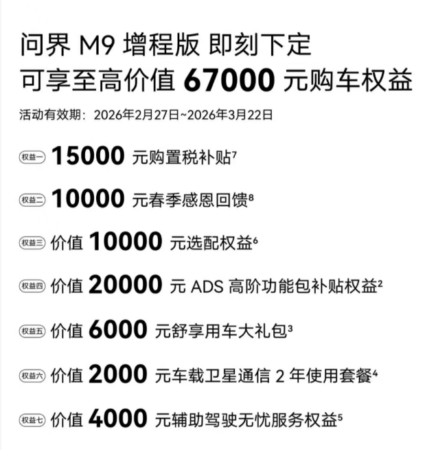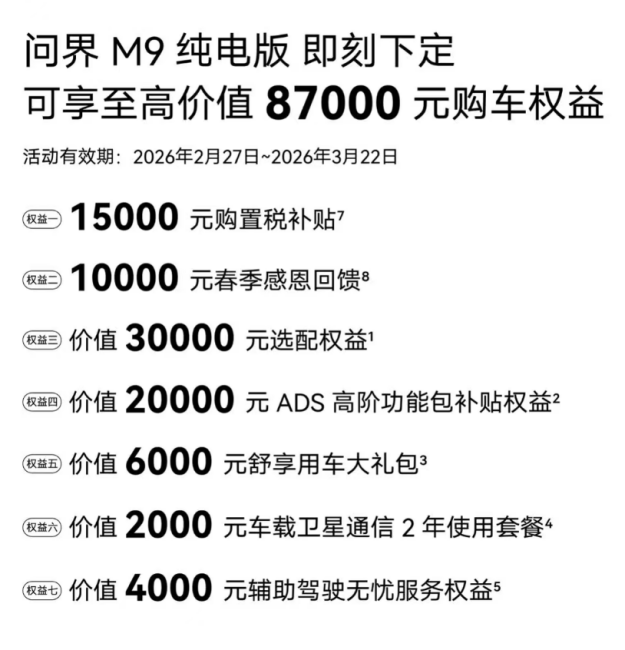 即日起至3月22日,下定問界M9至高可享87000元購車權益,涵蓋購置稅補貼、春季感恩回饋及ADS高階功能包補貼等多重福利。