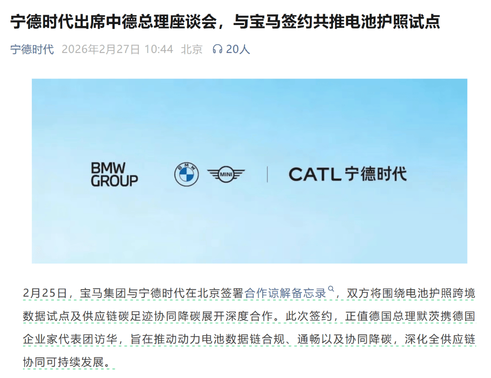 2月25日,寶馬集團(tuán)與寧德時代在北京簽署合作諒解備忘錄,雙方將圍繞電池護(hù)照跨境數(shù)據(jù)試點及供應(yīng)鏈碳足跡協(xié)同降碳展開深度合作。