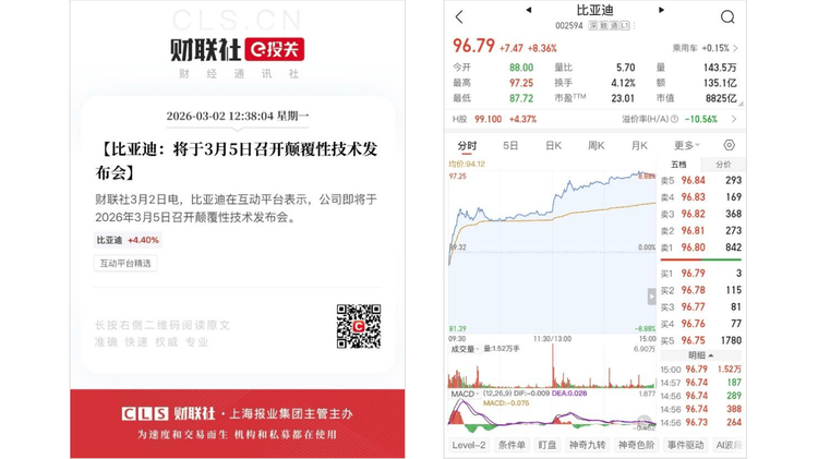 技術端的重磅消息更讓市場充滿期待。3月2日比亞迪官宣3月5日舉辦顛覆性技術發布會,消息一出,公司A股當日大漲8.36%,市值穩居高位,資本市場用腳投票,彰顯對其技術實力的高度認可。據悉,此次發布會或將推出快充、高功率電機等前沿技術,有望為行業發展帶來新突破。