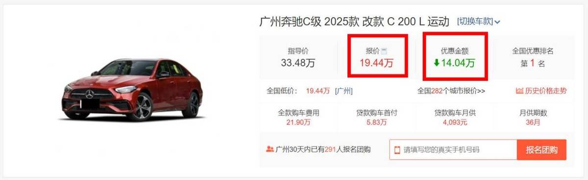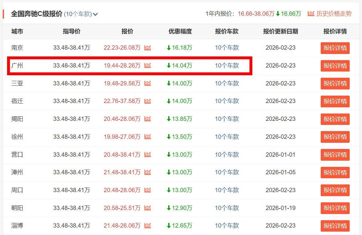 也是沒想到,這個(gè)春節(jié)假期一過完,像奔馳C級這樣的老牌豪華燃油車就大降價(jià)了。就拿給出了全國最低報(bào)價(jià)的廣州來說,奔馳C級報(bào)價(jià)19.44-28.26萬元,優(yōu)惠幅度高達(dá)14.04萬。