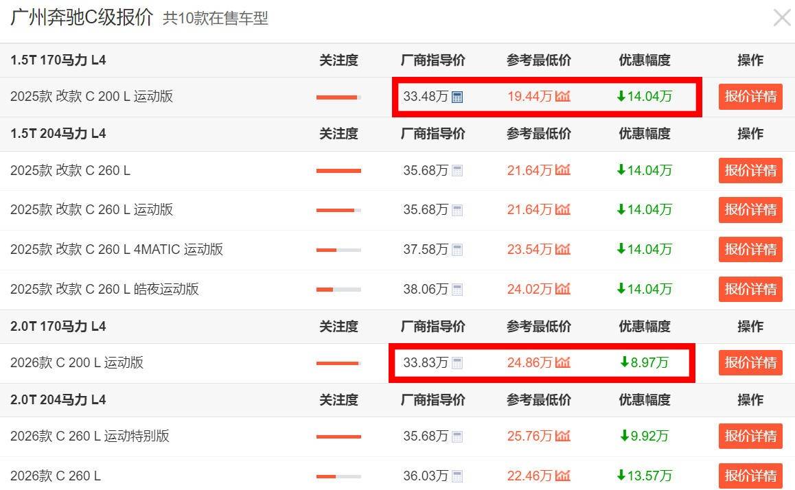至于為什么要清庫存,主要也是為了給新上市不久的2026款(2.0T)奔馳C級車型讓路。畢竟,2026款車型全系都搭載了2.0T發(fā)動(dòng)機(jī),而此前的2025款車型則還是配備的1.5T發(fā)動(dòng)機(jī)。