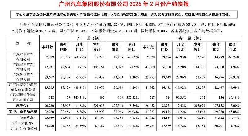 3月2日,廣汽集團(tuán)發(fā)布2026年2月份產(chǎn)銷(xiāo)快報(bào)。數(shù)據(jù)顯示,2026年2月份,廣汽集團(tuán)銷(xiāo)量為86452輛,同比下降12.43%,今年1-2月份,廣汽集團(tuán)累計(jì)銷(xiāo)量為203074輛,同比增長(zhǎng)3%。