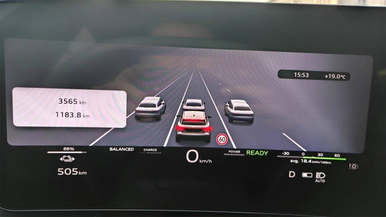 重要的數(shù)據(jù)和標(biāo)識(shí)全在儀表底部,防止被方向盤阻擋。只是功率計(jì)的顯示方式不太直觀,比較重要的行車數(shù)據(jù)顯示也有點(diǎn)少。智駕SR渲染略顯粗糙,感知的障礙物狀態(tài)不是很穩(wěn)定,也缺少諸如周邊車輛剎車燈狀態(tài)、周邊不規(guī)則障礙物輪廓這樣的細(xì)節(jié)信息。