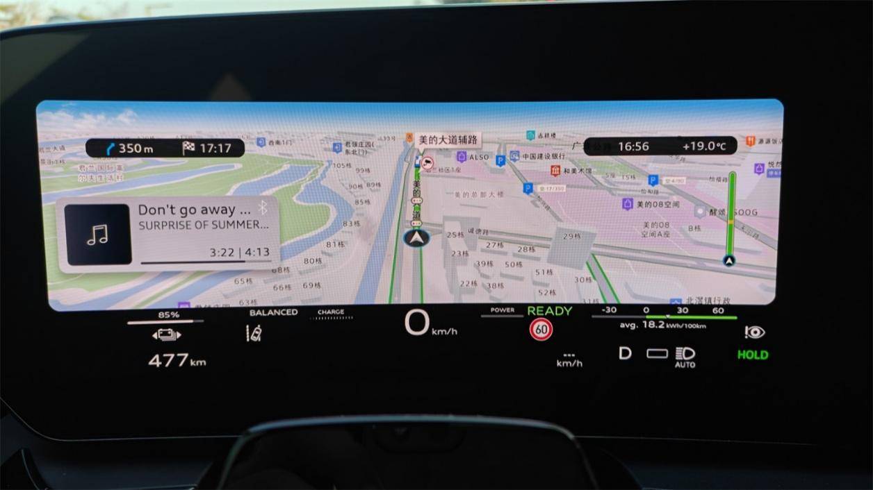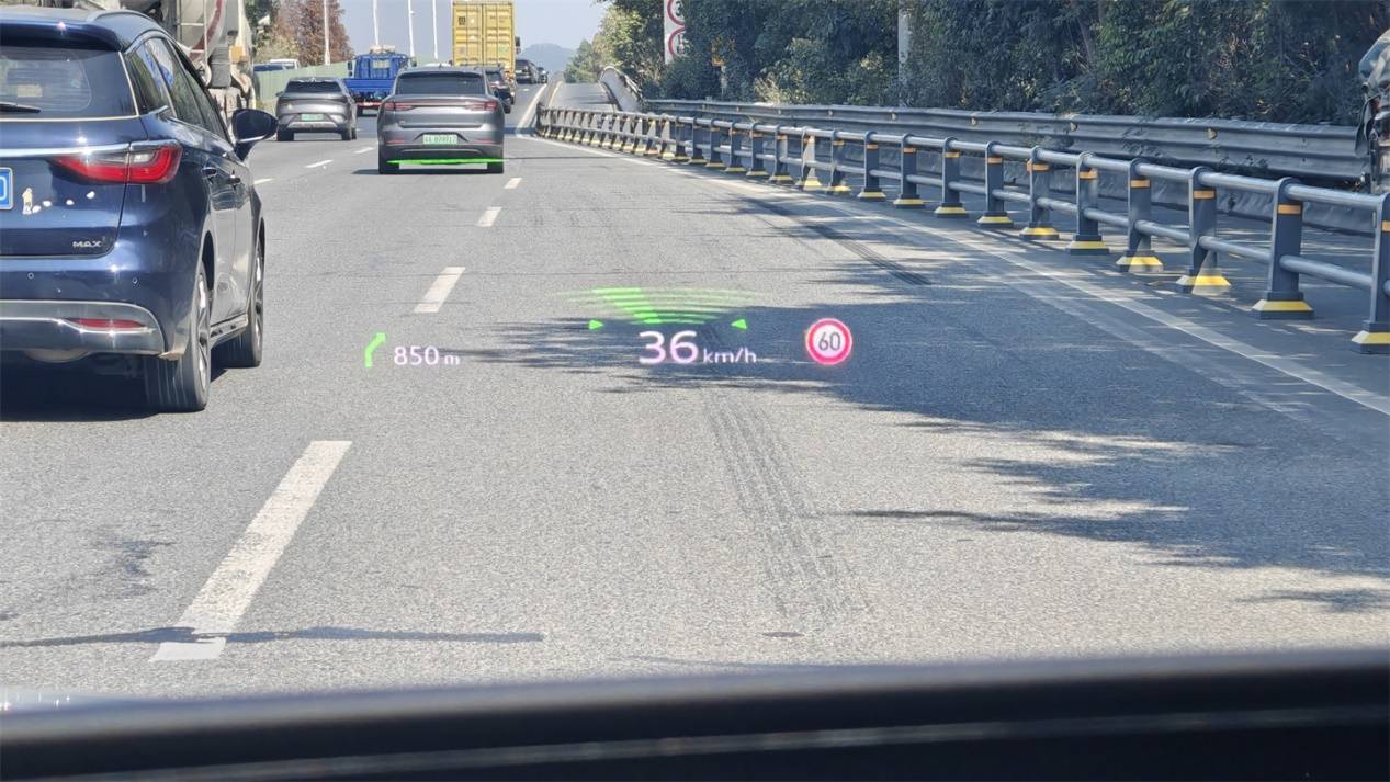 相比之下,這塊88英寸的AR-HUD讓人眼前一亮。相比起其他家堆砌信息的做法,這套HUD顯得很有分寸感。由于儀表盤被保留了下來,所以HUD的界面上只有立體化的路面指引、車速、導(dǎo)航指引,以及部分警示標(biāo)志等核心信息,最大限度避免了非必要數(shù)據(jù)的干擾。