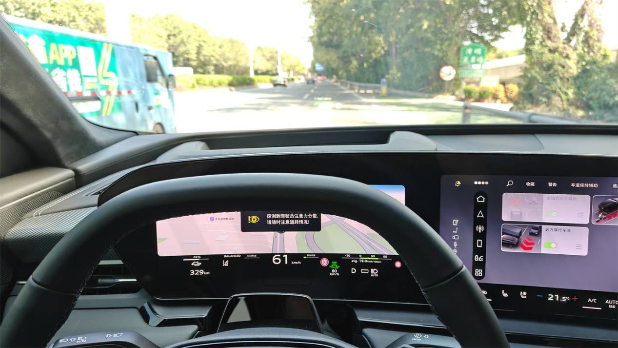 和鴻蒙智行系的車型一樣,這臺(tái)Q6L e-tron的領(lǐng)航功能,要在車道線清晰的情況下才能開啟。然而同樣是“華為”家出品,它的行駛風(fēng)格卻和“界”字輩的兄弟差別明顯,很喜歡縮在最右側(cè)車道,直到道路前方有分岔、路口、過彎等情況下才會(huì)匆忙變道,經(jīng)常需要人為打燈來“催促”其變道,有時(shí)候甚至?xí)虼隋e(cuò)過路口或者壓上實(shí)線。