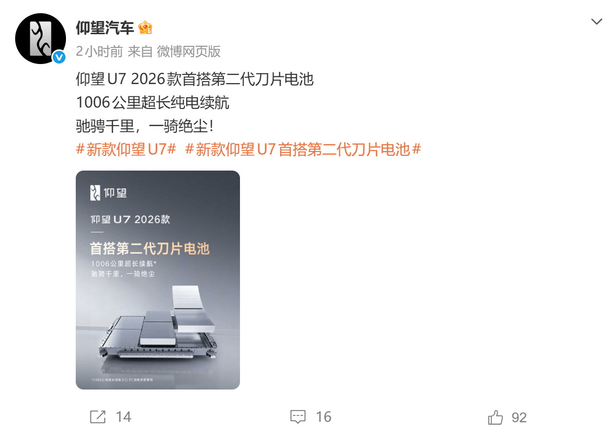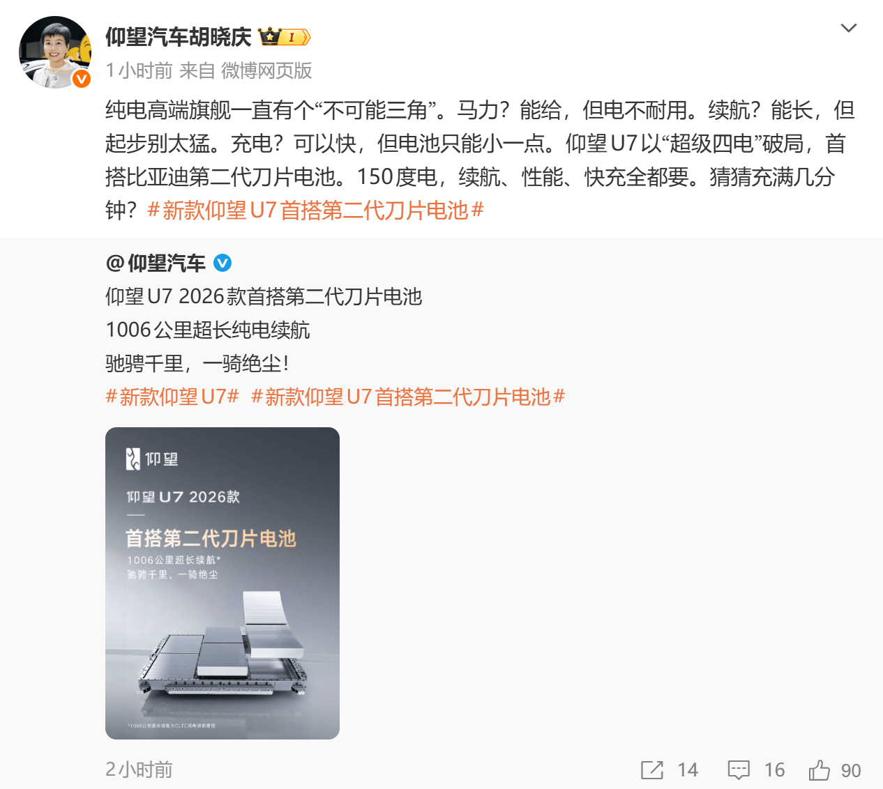 另外,仰望銷售事業部總經理胡曉慶也在社交媒體上,純電旗艦以前老被“馬力、續航、快充”這個“不可能三角”卡脖子——要性能電池就得大,電池大快充就難熱管理就炸。第二代刀片電池的思路是系統層面做協同,靠高壓平臺和整車熱管理硬扛大電流,把三角往“等邊”拉一拉。