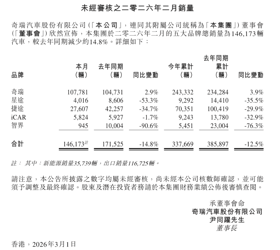 官方數據顯示,2026年2月,星途品牌單月銷量僅為4016臺,相較去年同期遭遇了53.3% 的斷崖式下滑。