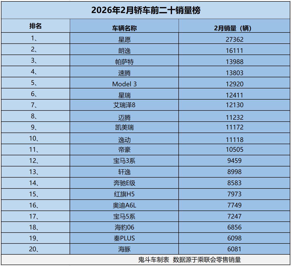 由于春節假期與消費節奏的影響,2月轎車市場降溫了。銷量就是最好的證明,從乘聯會零售銷量數據看到,2月份,只有11款轎車銷量過萬,跟以往的銷量表現相比,差距顯而易見。接下來,看看2月轎車市場銷量排名前二十榜單,看看哪些車型榜上有名?誰的銷量表現更出眾?
