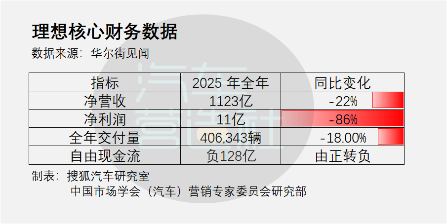 2025年,理想的凈利潤僅剩11億元,同比大減86%,自由現金流由24年的586億由正轉為負128億人民幣。2024年,理想還站在“50萬輛、1445億元營收、80億元凈利潤”的高位上,短短一年,這個故事的情節卻急轉直下。