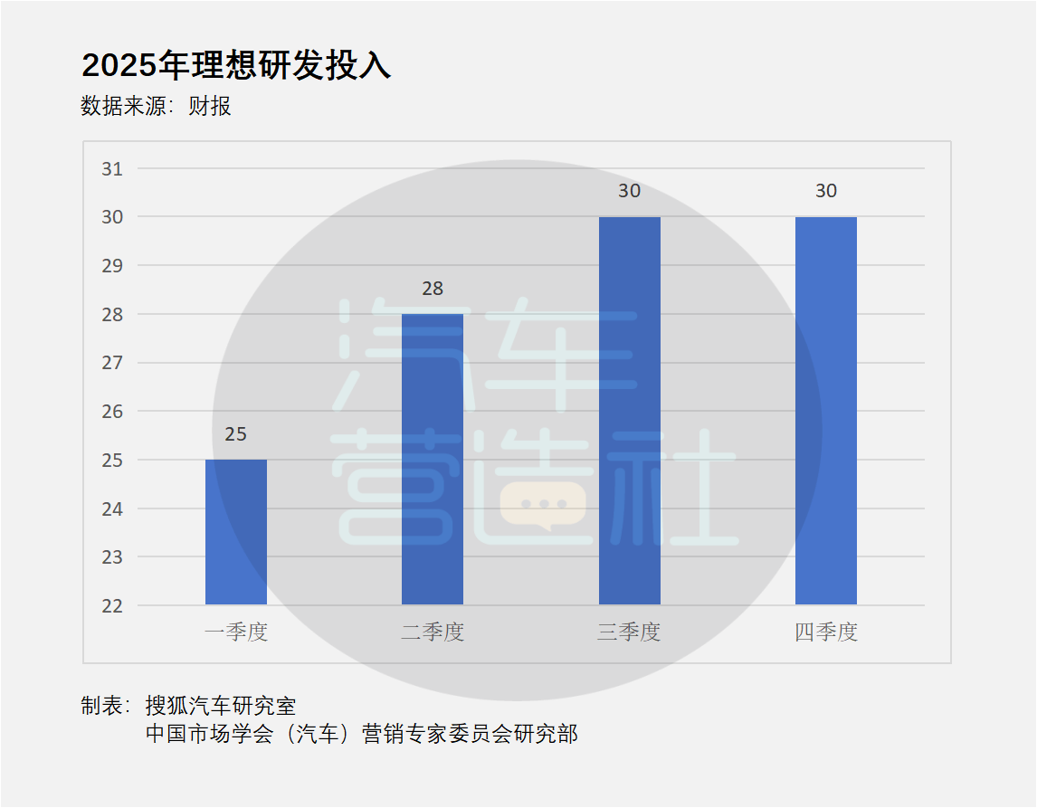 一家公司在利潤承壓時最誠實的動作,往往不是口號,而是預算。在過去一年中,盡管銷量和利潤持續承壓,但理想每個季度的研發費用基本穩定在28億元左右,甚至三、四季度持續加碼,并沒有因為營收的下降而“節衣縮食”。