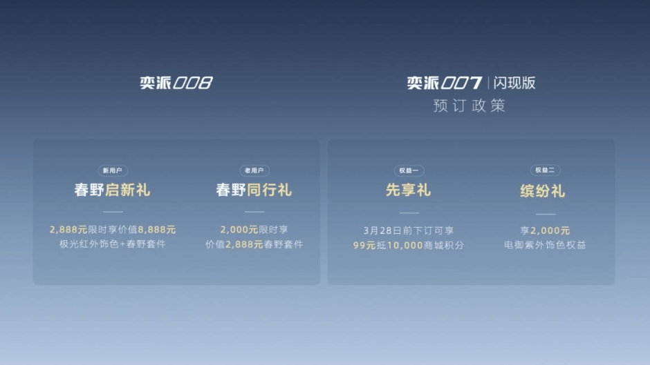 針對奕派008,新用戶可享2888元限時選購價值8888元的極光紅外飾色+春野套件,老用戶則可享2000元限時選購價值2888元的春野套件,權(quán)益有效期為3月14日19:00至3月31日24:00。奕派007閃現(xiàn)版預(yù)訂用戶可在3月28日前享受99元抵10000商城積分及價值2000元電御紫外飾色權(quán)益。