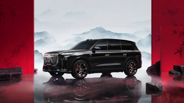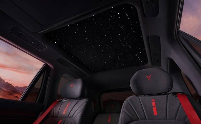 座艙內部將隱奢質感拉至滿格。設計師以大面積墨色為底,在縫線與頭枕等關鍵之處巧妙點綴丹砂紅并采用層疊線條立體絎縫工藝,模仿鎧甲片片相扣的精密感,中央更嵌入精致的紅色高頻焊圖案。這一細節不僅拉滿了百萬級的奢華觸感,更隱喻了藏鋒于內斂之下的俠者風范。搭配高品質黑水晶鉆石切割按鍵與流云墨韻飾板,細節處盡顯藏而不露的高端格調。新車越級配備與百萬豪車同源的星河天幕,598顆燈珠營造出靜謐的星空儀式感,它將中式豪華的內斂之美推向了極致。