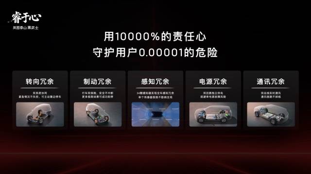 此外,車輛不僅深度融合華為乾崑ADS系統,更在轉向、制動、感知、通訊和電源五大核心維度,全部配備了頂級的安全雙冗余設計。這種獨家配置真正實現了系統級的穩如泰山。對于追求極致安全的高凈值家庭而言,這無疑是當下最穩妥的智駕首選。