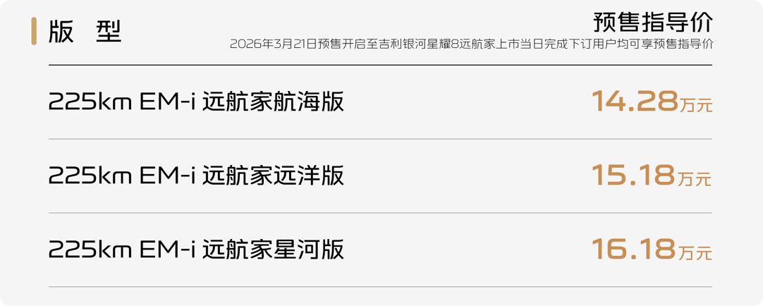 以14.28萬元的起售價切入市場,吉利銀河星耀8“遠航家”的預售開啟,無疑向中高級插電混動轎車市場投入了一枚深水炸彈。