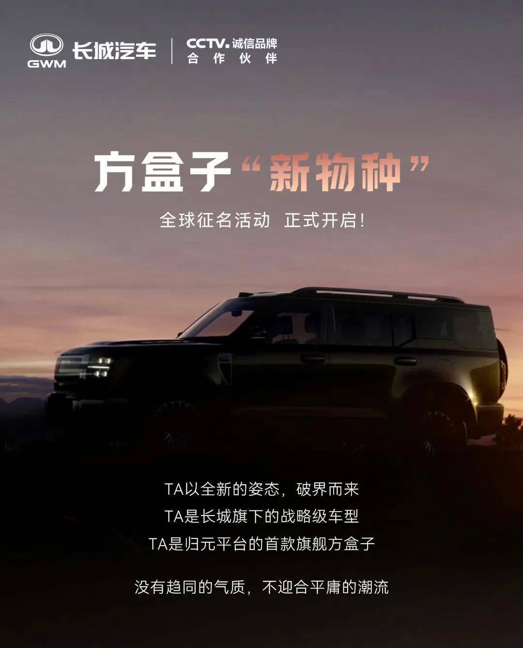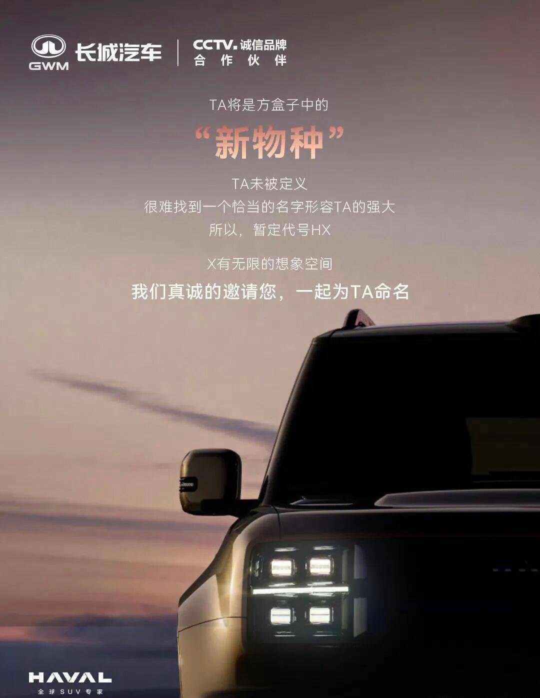 長城哈弗今天發(fā)了臺新車官圖,代號HX,歸元平臺的第一款方盒子旗艦。名字還沒定,但搞了個全球征名。大概率想復(fù)制當(dāng)年坦克300、哈弗大狗那波熱度。