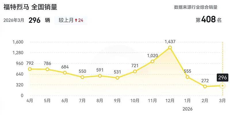 數(shù)據(jù)顯示,2026年3月份,福特烈馬的銷量為296輛,相比2026年2月份的銷量272輛,增長(zhǎng)24輛,不過相比2025年3月份的銷量741輛,卻同比下滑60.05%。