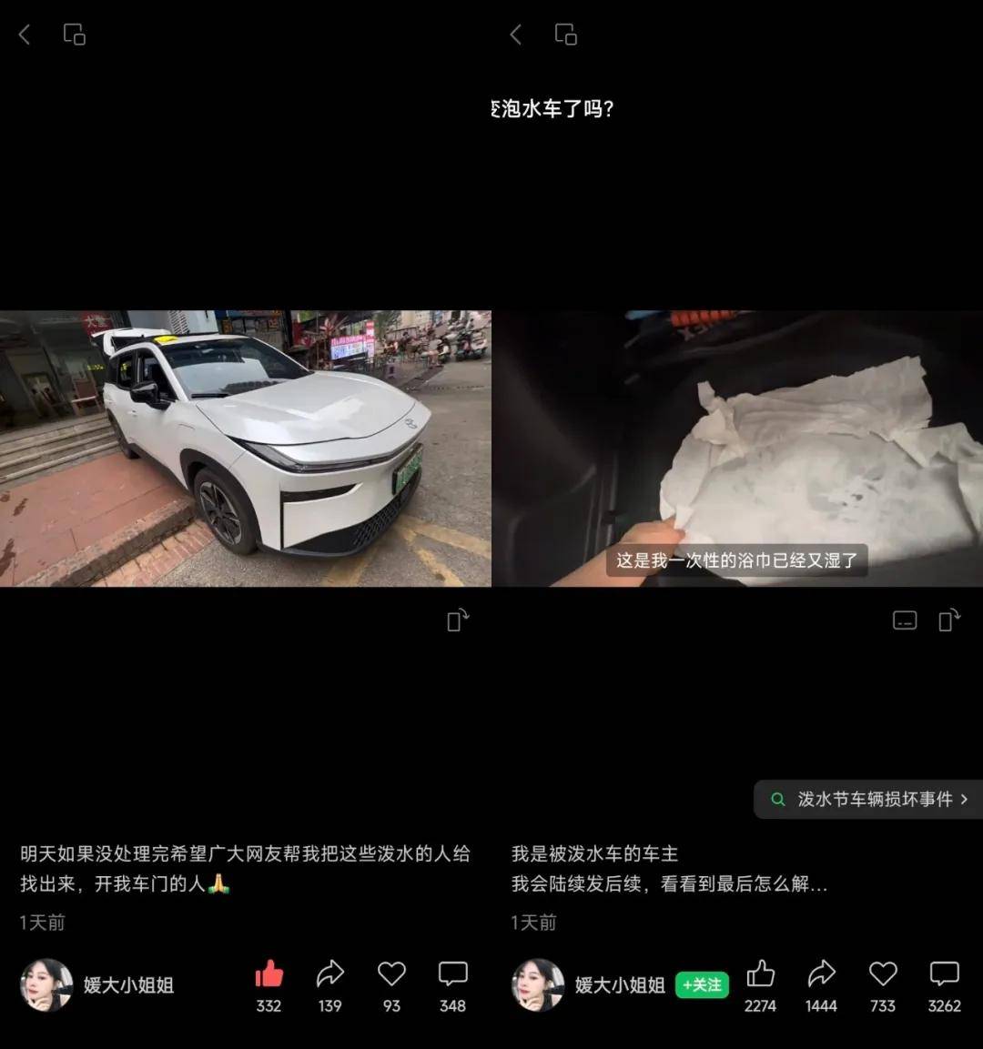 目前她的愛車鉑智3X已經用浴巾等里里外外擦拭了一遍,并且放在外面“涼了一天”,但后備箱依舊濕透了,她直言如果她的這臺新能源電動車因為被潑水接下來出現問題的話,會報警維權!
