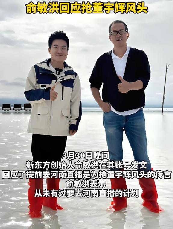 在與輝同行湖北行程結束后,董宇輝透露了想要探訪河南跟香港的想法,而3月27日,新東方文旅聯合河南分公司,發布視頻稱將在4月1日到4月3日,開啟首場戶外直播活動,視頻中表示俞敏洪將會前往鄭州、洛陽和安陽三地,這個消息迅速引起了大量的網友關注,有不少人質疑,這是俞敏洪為了搶董宇輝的風頭。