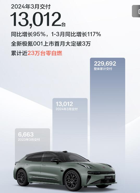 3月銷量/交付量:極氪3月銷售新車13012輛