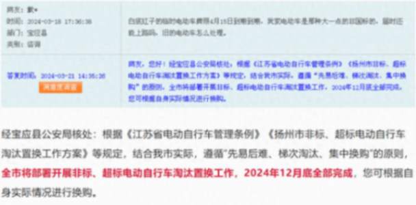 其實4月以來,有不少城市都面臨非標車到期淘汰的問題。此前江蘇多地都已發布通知,明確非標電動自行車將于2024年4月15日后禁止上路。不過最近又有地區放寬要求,通過江蘇寶應縣公安局的回復來看,在結合當地實際情況的前提下,按照“先易后難、梯次淘汰、集中換購”的原則,在2024年12月底完成非標電動自行車淘汰置換工作。