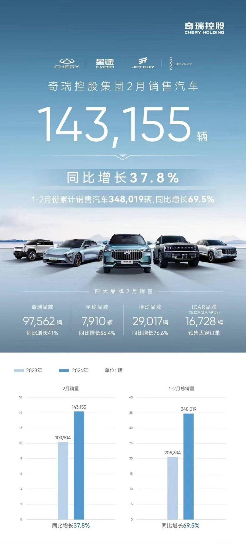 時光荏苒,就算是時間來到了「內卷」更為嚴重的2024年,奇瑞的銷量增長態勢也依舊不減。在2024年1-2月份,奇瑞累計銷售汽車348,019輛,同比增長69.5%。其中2024年1月奇瑞集團銷量200,992輛,同比增長107.5%,連續第4個月單月銷量突破20萬輛。并且在2月份,奇瑞集團銷售汽車143,155輛,成為中國品牌汽車銷量第一。而繼3月30日發布風云A8遠航版之后,在4月2日,奇瑞控股集團也是發布了最新銷量快報。據悉,奇瑞集團3月份銷售汽車181,585輛,同比增長45.3%;至此,奇瑞一季度累計銷售汽車達到了529,604輛,同比增長60.3%。